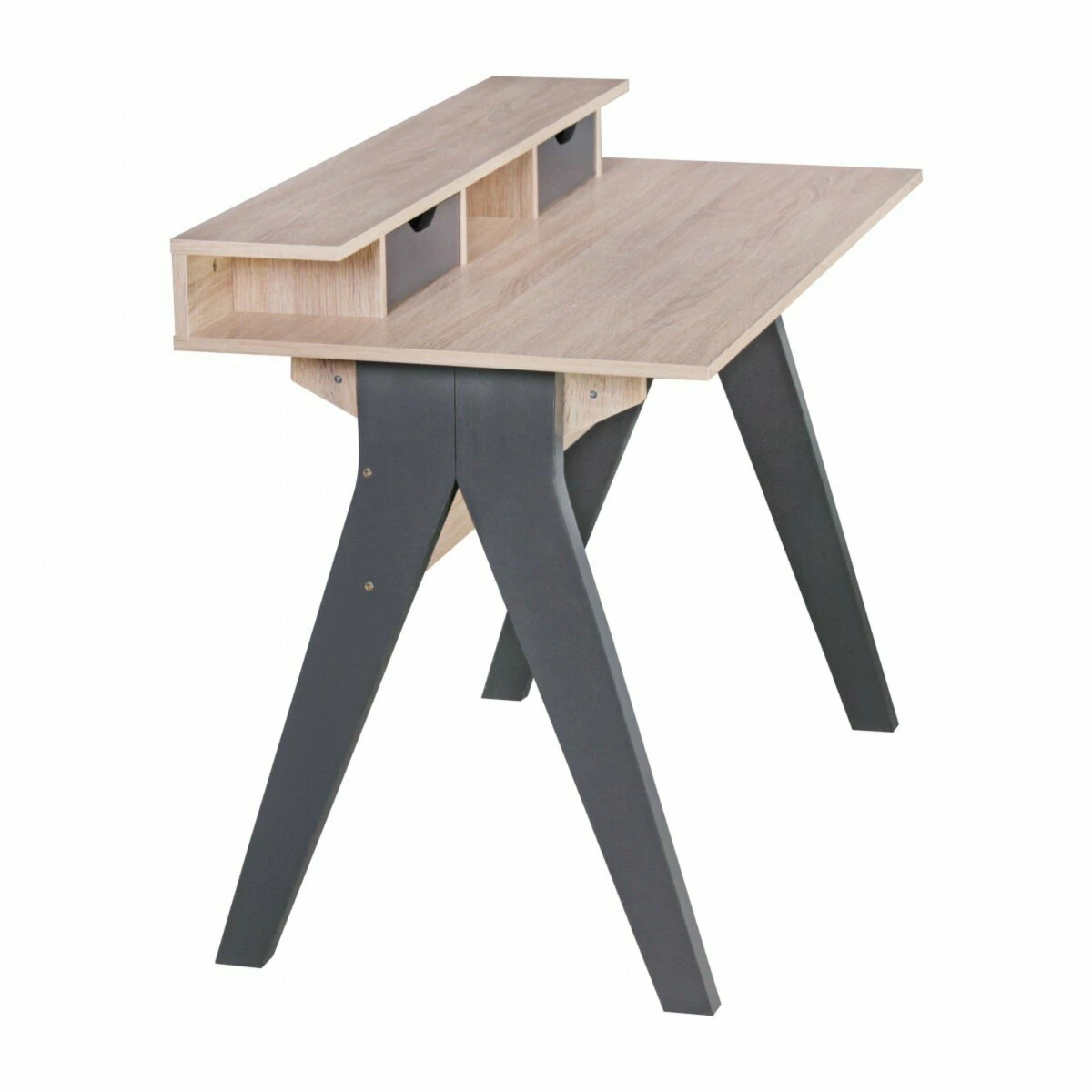 Der extravagante Schreibtisch aus Holz ist in zeitloser Sonoma Eiche Nachbildung gehalten und hat interessante Absetzungen in Schwarz. Der Schreibtisch ist ein optisches Highlight und auch in seiner Funktion ist er unschlagbar. Zwei Schubladen, die auf Ihre jeweiligen Bedürfnisse angepasst werden können, sind für kleine Utensilien vorhanden. Drei offene Fächer bieten ebenfalls noch Stauraum.