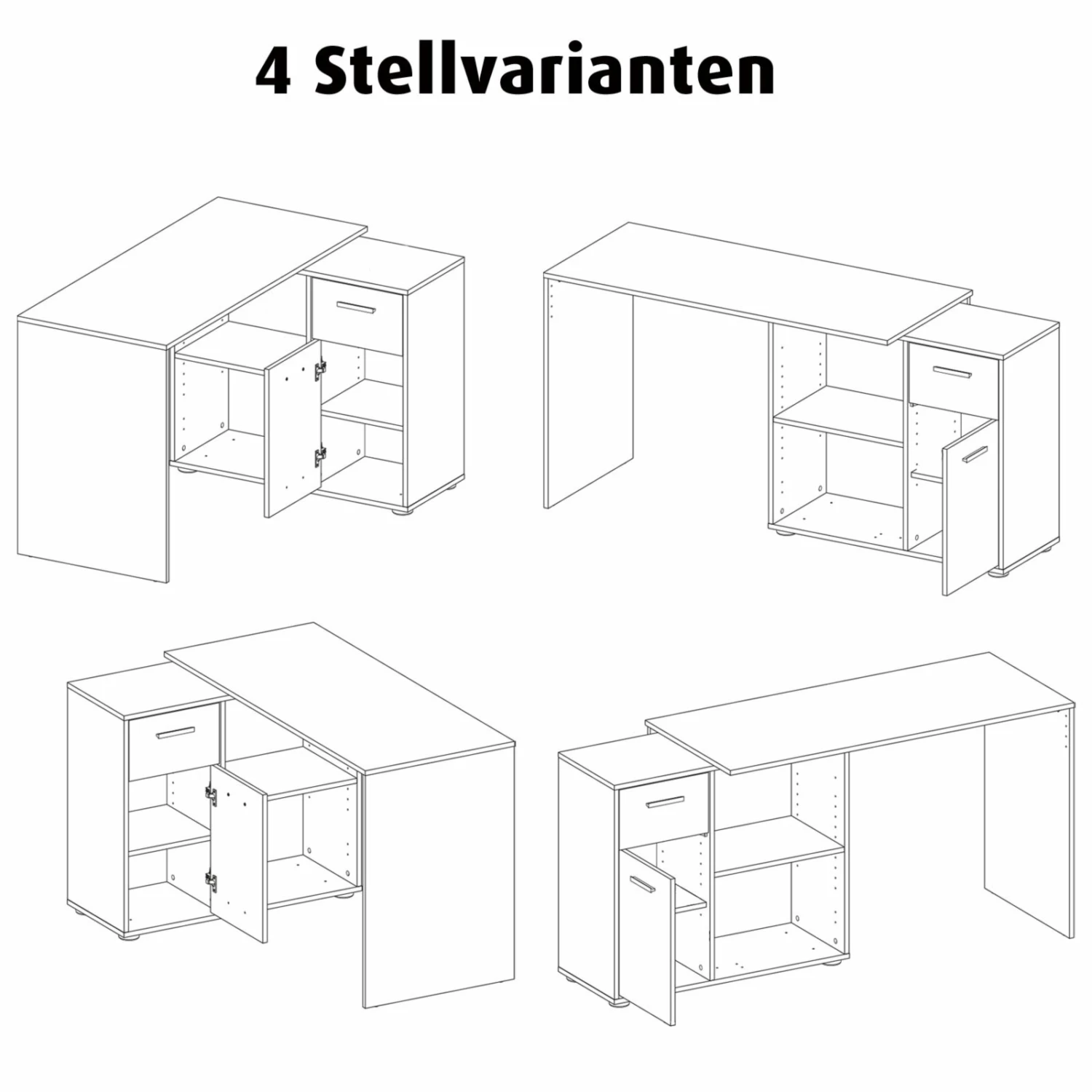 Ein Schreibtisch – vier Aufstellmöglichkeiten! Dieser Schreibtisch macht jeden Umzug und jede Möbelumstellung mit, denn es gibt vier Varianten, wie Sie ihn stellen können. Nutzen Sie Ihn z.B. an der Wand als rechteckigen Schreibtisch und wählen Sie, ob die Verstauungsmöglichkeiten rechts oder links zu erreichen sind. Oder stellen Sie ihn in eine Ecke oder mitten in den Raum über Eck, so dass Sie z.B. Ihre Kinder oder den Eingang oder Ihre Kinder im Blick halten können. Auch hier wählen Sie, ob Ihre Unterlagen auf der rechten oder linken Seite griffbereit sein soll.