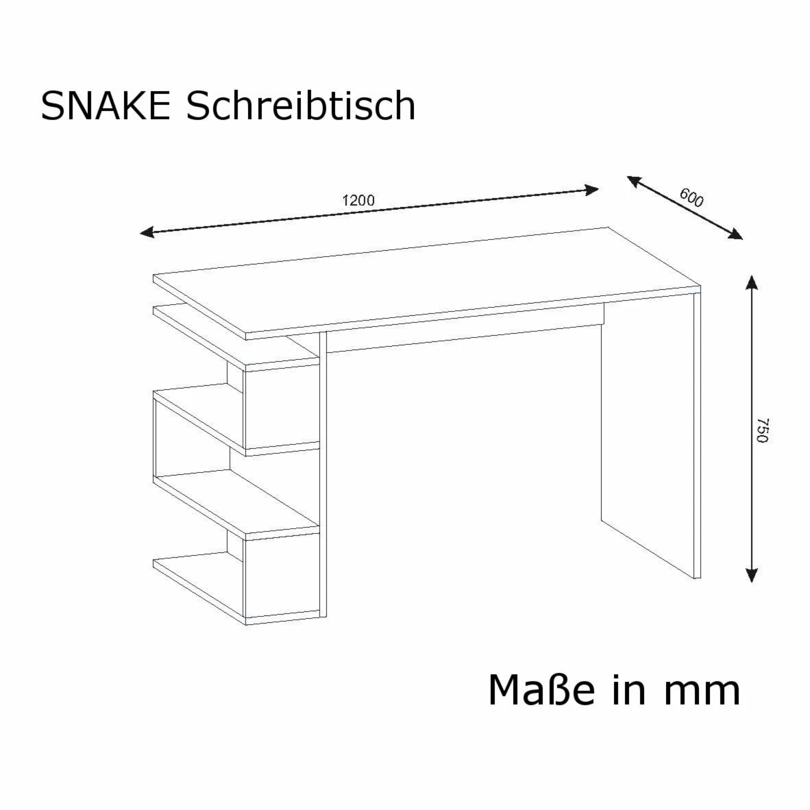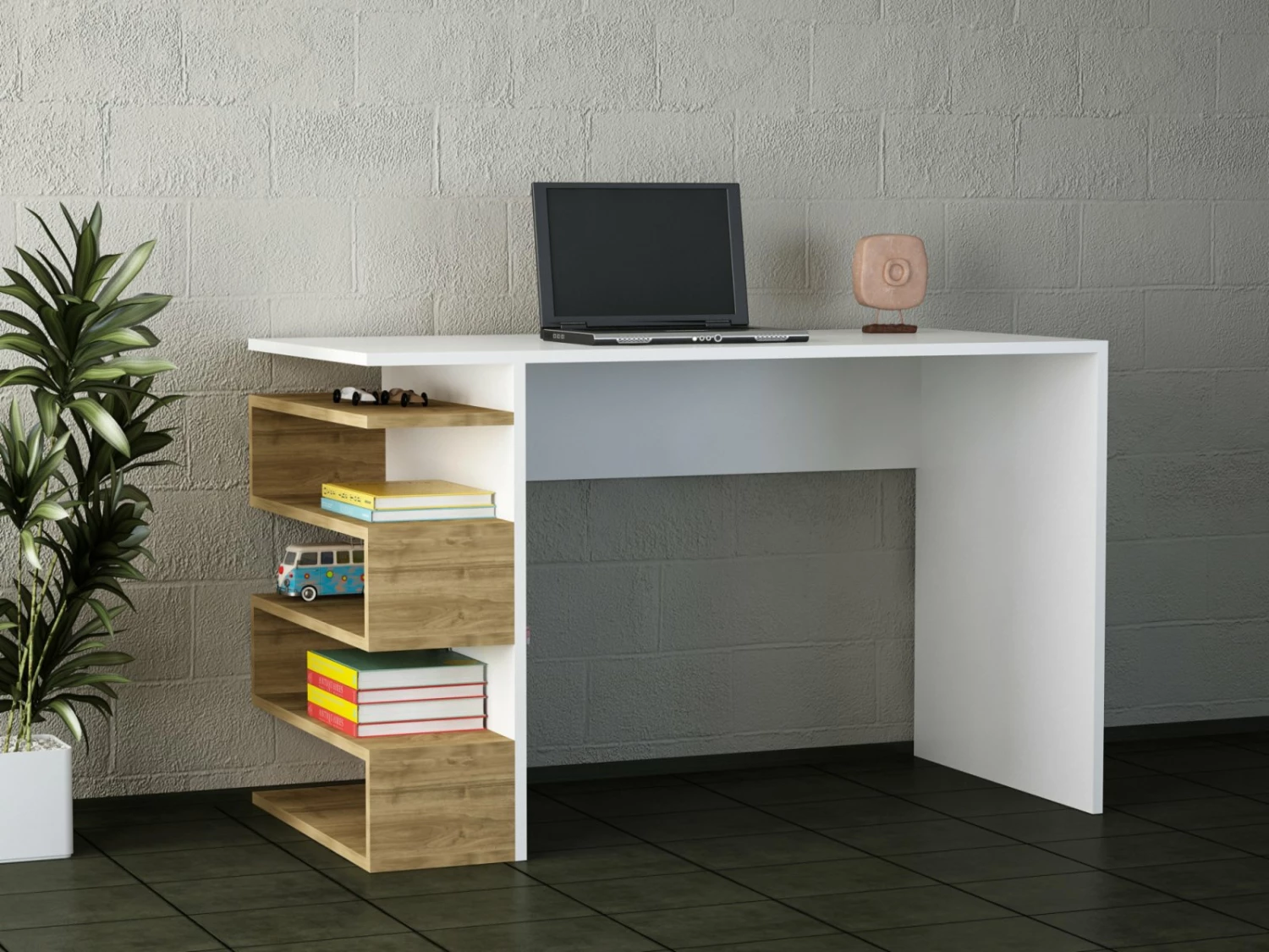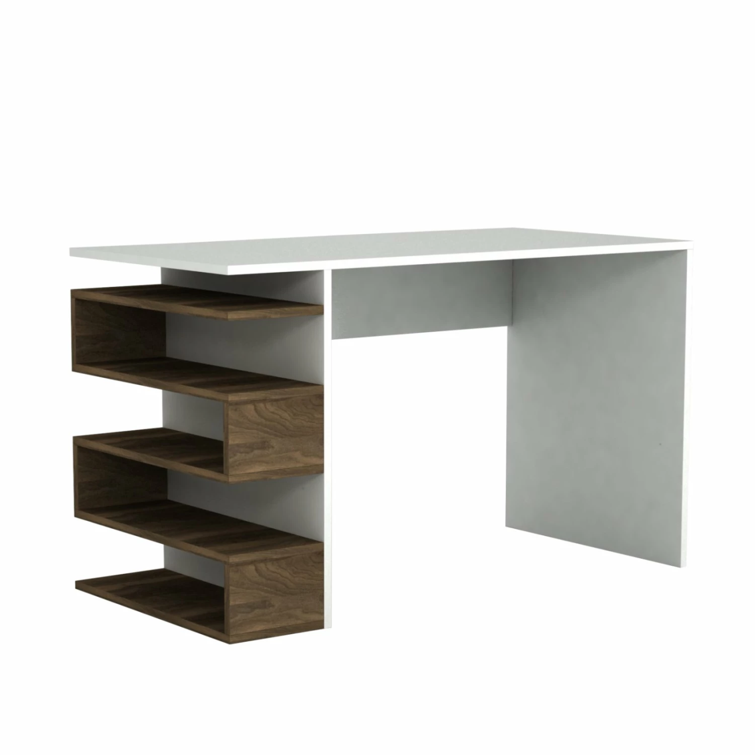 Moderner Schreibtisch in Weiß-Walnuss. Dank des Regalelements auf der Seite des Tisches haben Sie genügend Freiheit auf der Tischplatte und können hier entspannt Arbeiten oder Ihre Kinder gemütlich die Hausaufgaben erledigen.