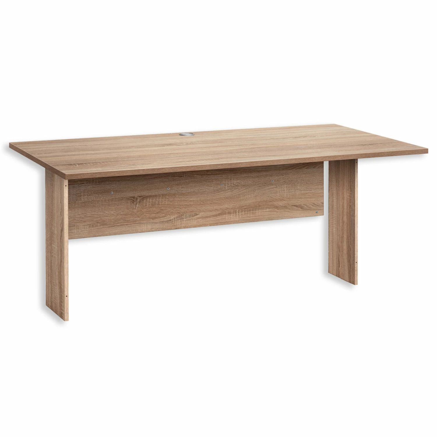 Die wunderschöne Schreibtischplatte in dezentem Sanoma-Eiche Farbton ist eine stilvolle Arbeitsfläche mit praktischer Kabeldurchführung und macht Ihnen das Arbeiten so angenehm wie möglich. Eine Traverse sorgt für zusätzliche Stabilität und ist zudem passender Sichtschutz. Die ABS-Kanten schützen die Tischecken vor Beanspruchung und Feuchtigkeit, womit sie einen perfekten Abschluss für dieses Möbelstück bilden.