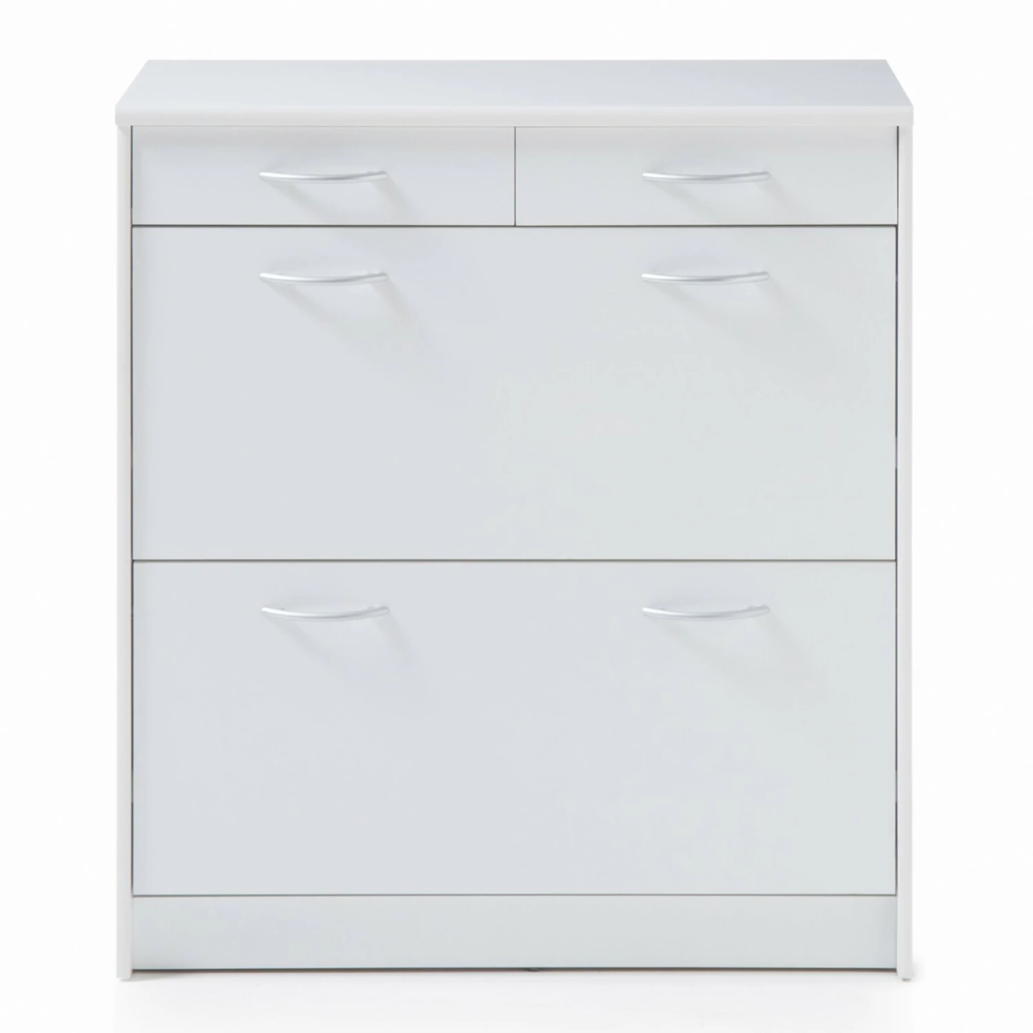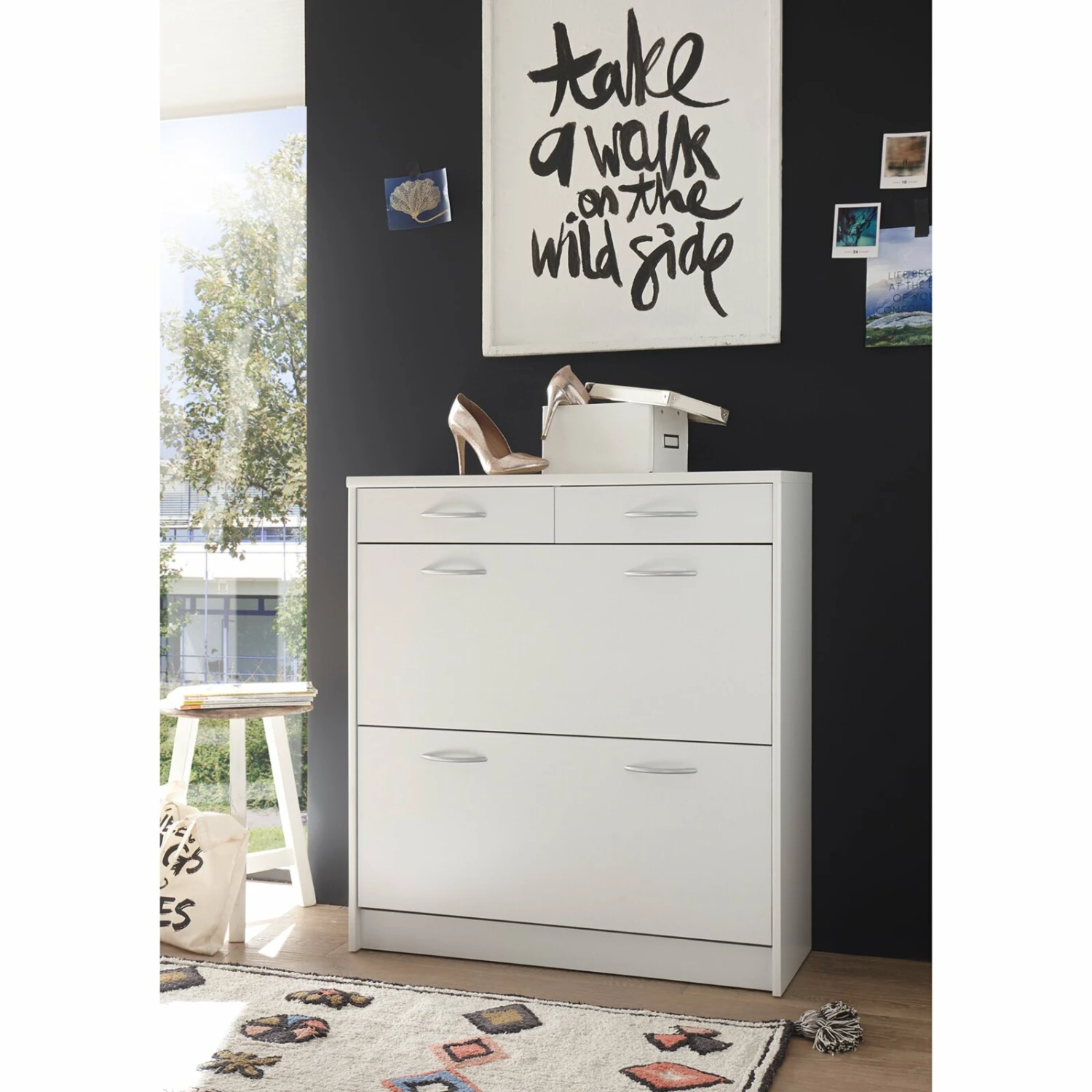 Praktischer Schuhschrank, der über zwei Klappen für Ihr Schuhwerk sowie zwei Schubkästen für beispielsweise Schuhputzzeug oder andere Utensilien verfügt. Die alufarbenen Griffe aus Kunststoff setzen sich optisch schön ab und erzeugen somit ein wohnliches Ambiente.