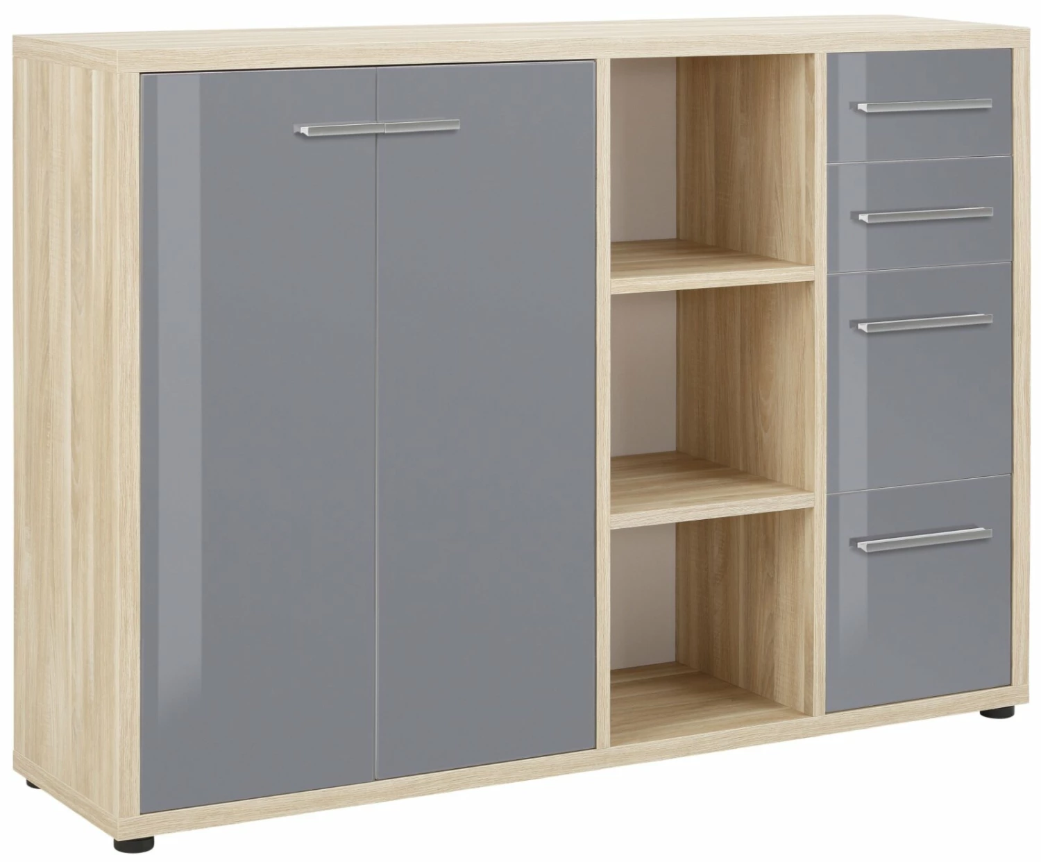 Stilvolles Sideboard mit Schubladen und Türen in einem Mix aus Eiche natur und Grauglas. In diesem Möbelstück können Sie ganz praktisch und übersichtlich Ihre Büro- oder andere Utensilien aufbewahren. Die Melaminharzbeschichtung verhindert Kratzer auf der Oberfläche und mit ABS-Kanten ist der Schrank langfristig vor Abnutzungserscheinungen geschützt.