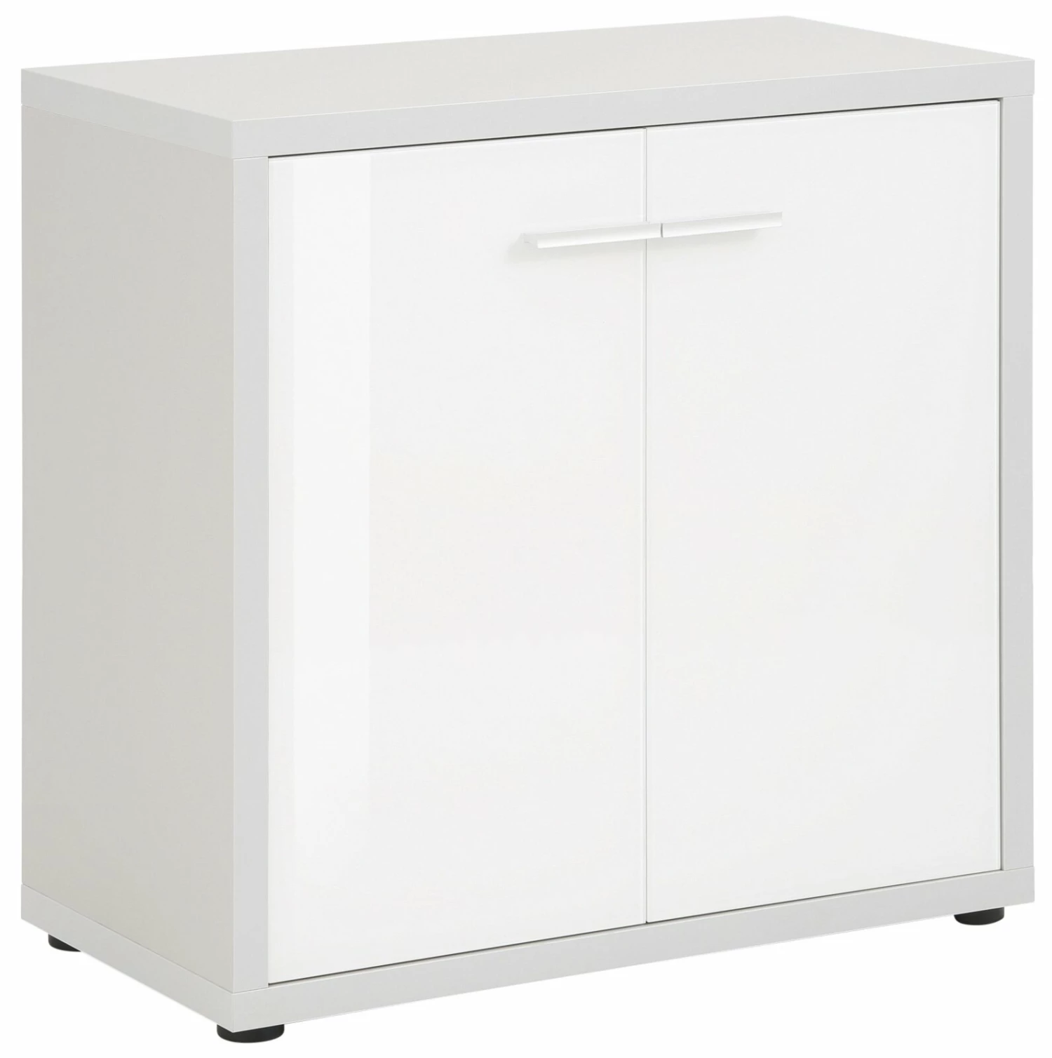 Platingraues Sideboard SET+ mit 2 Türen mit Weißglasbesatz und einem Einlegeboden. Der Korpus ist mit Melaminharz beschichtet und die Kanten mit ABS ausgestattet, so ist dieses Schränkchen kratz- und stoßunempfindlich.