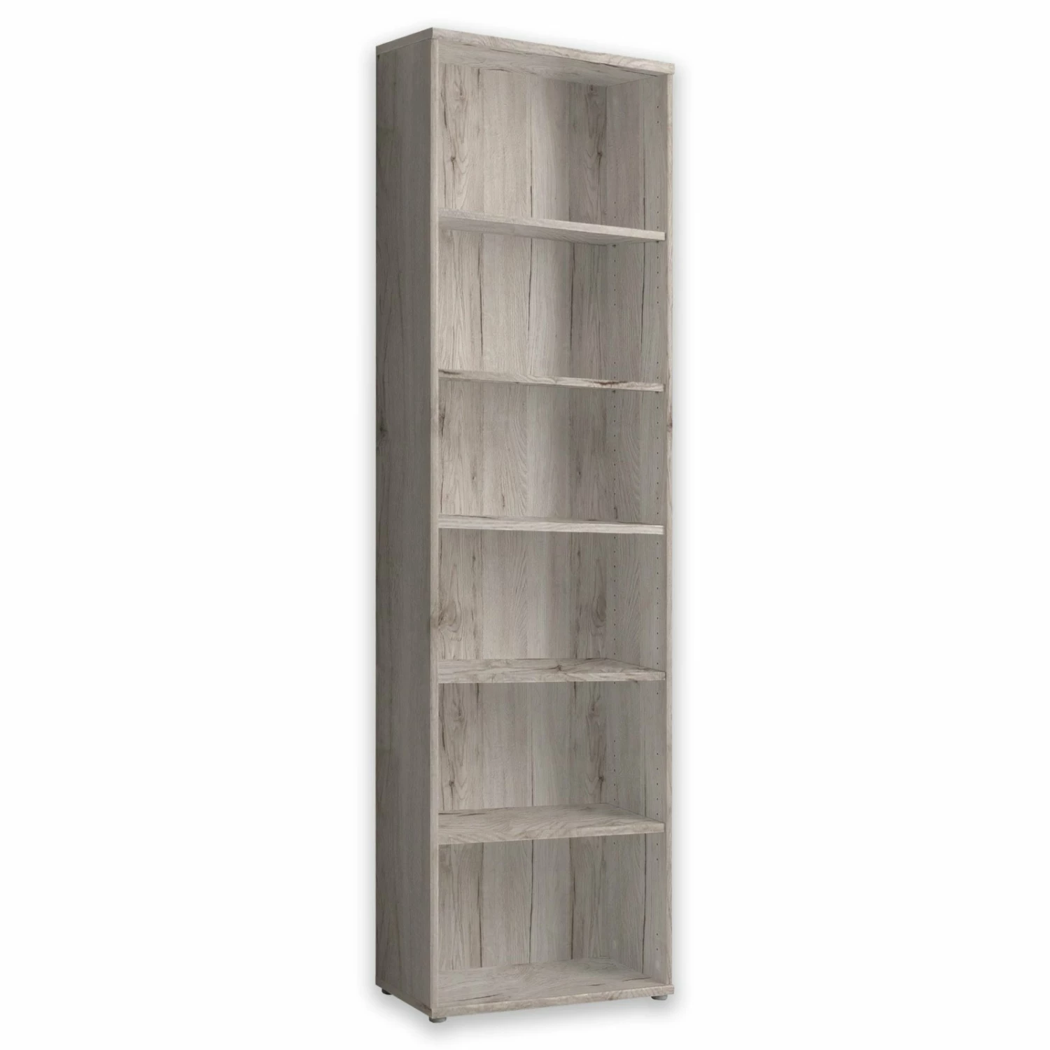 Das Standregal in Sandeiche Nachbildung bietet ausreichend Stauraum für Ihre Dekoration, Ihre Lieblingsbücher oder andere kleine Utensilien. Vier Einlegeböden können in der Höhe variiert werden und ein fester Konstruktionsboden ist auch vorhanden. Jeder der Böden kann mit etwa 5 kg belastet werden.