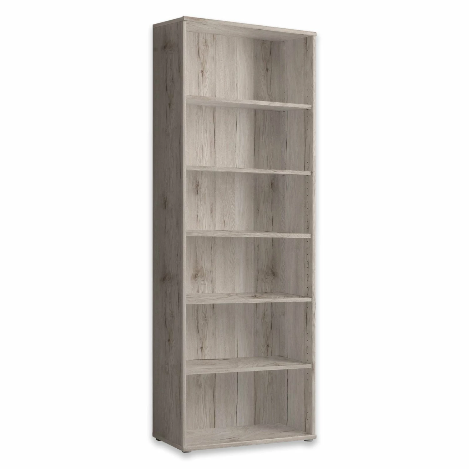 Das Standregal in Sandeiche Nachbildung ist zeitlos gestaltet und lässt sich einfach mit vielen Einrichtungsstilen kombinieren. Vier Einlegeböden können in der Höhe variiert werden und ein fester Konstruktionsboden ist ebenfalls vorhanden.