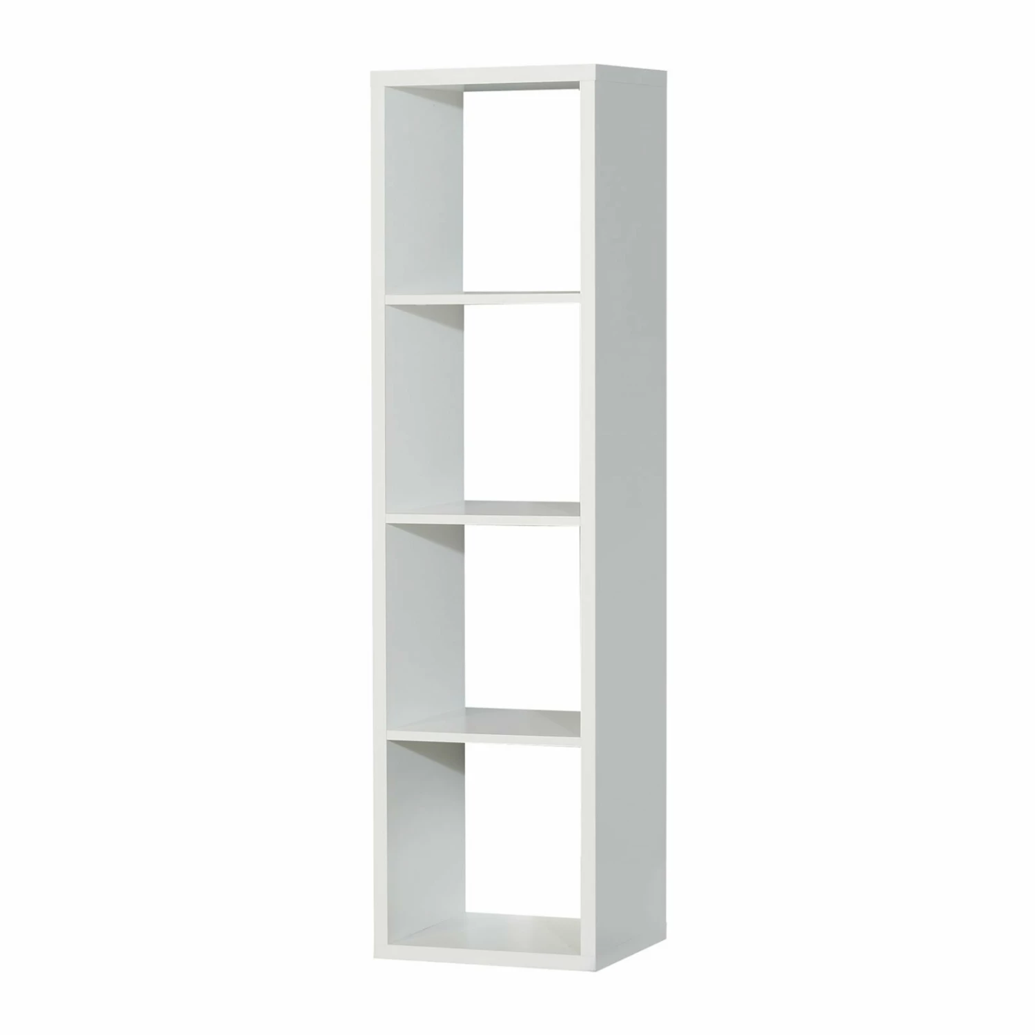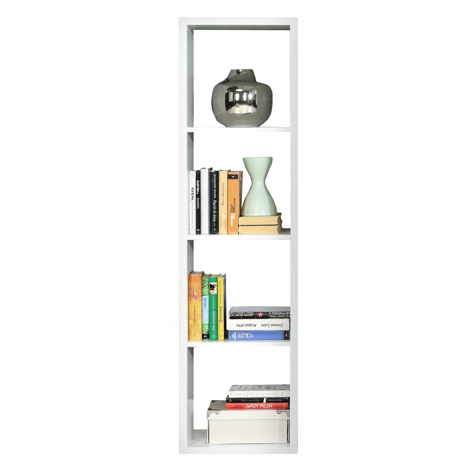 Vier offene Fächer, in denen zum Beispiel Bücher oder Dekorationsartikel untergebracht werden können, bietet dieses weiße Standregal. Da das Regal keine Rückwand hat, ist es von beiden Seiten zugänglich. Das Regal kann perfekt in Nischen untergebracht werden, da es sehr schmal ist.