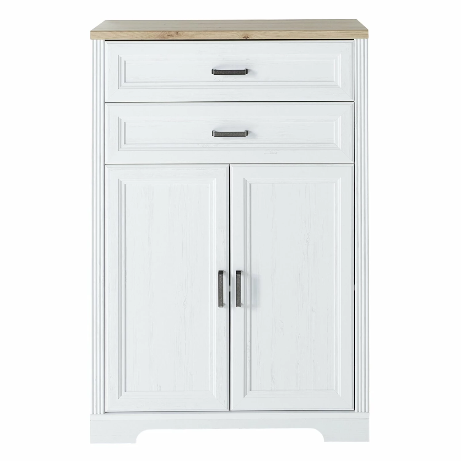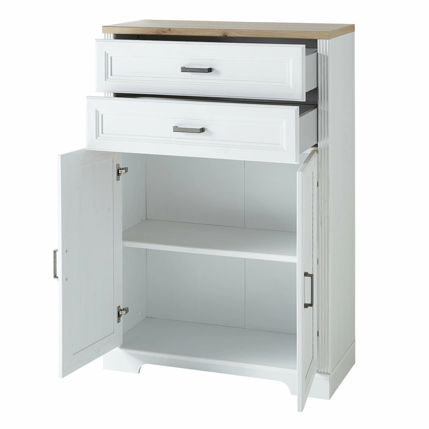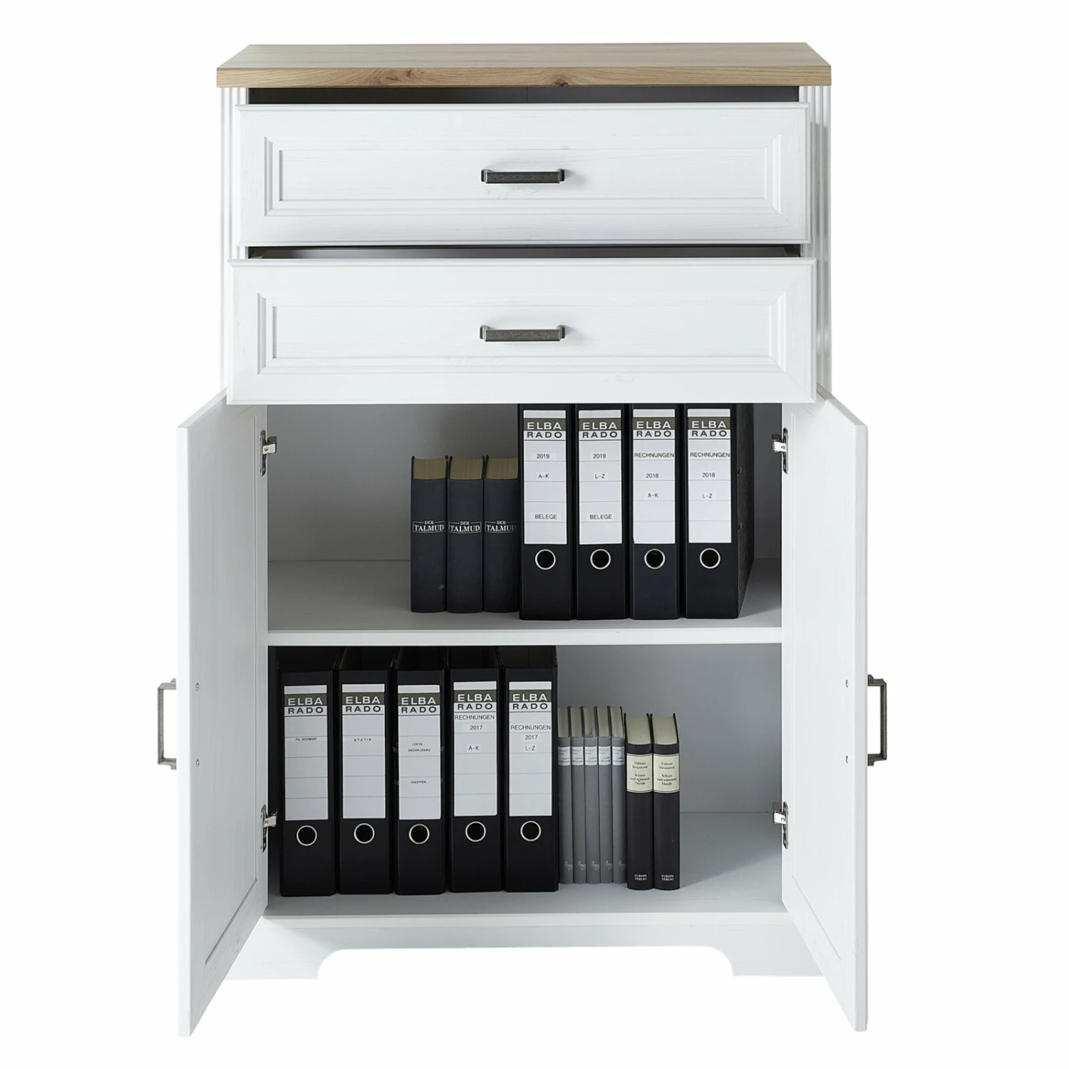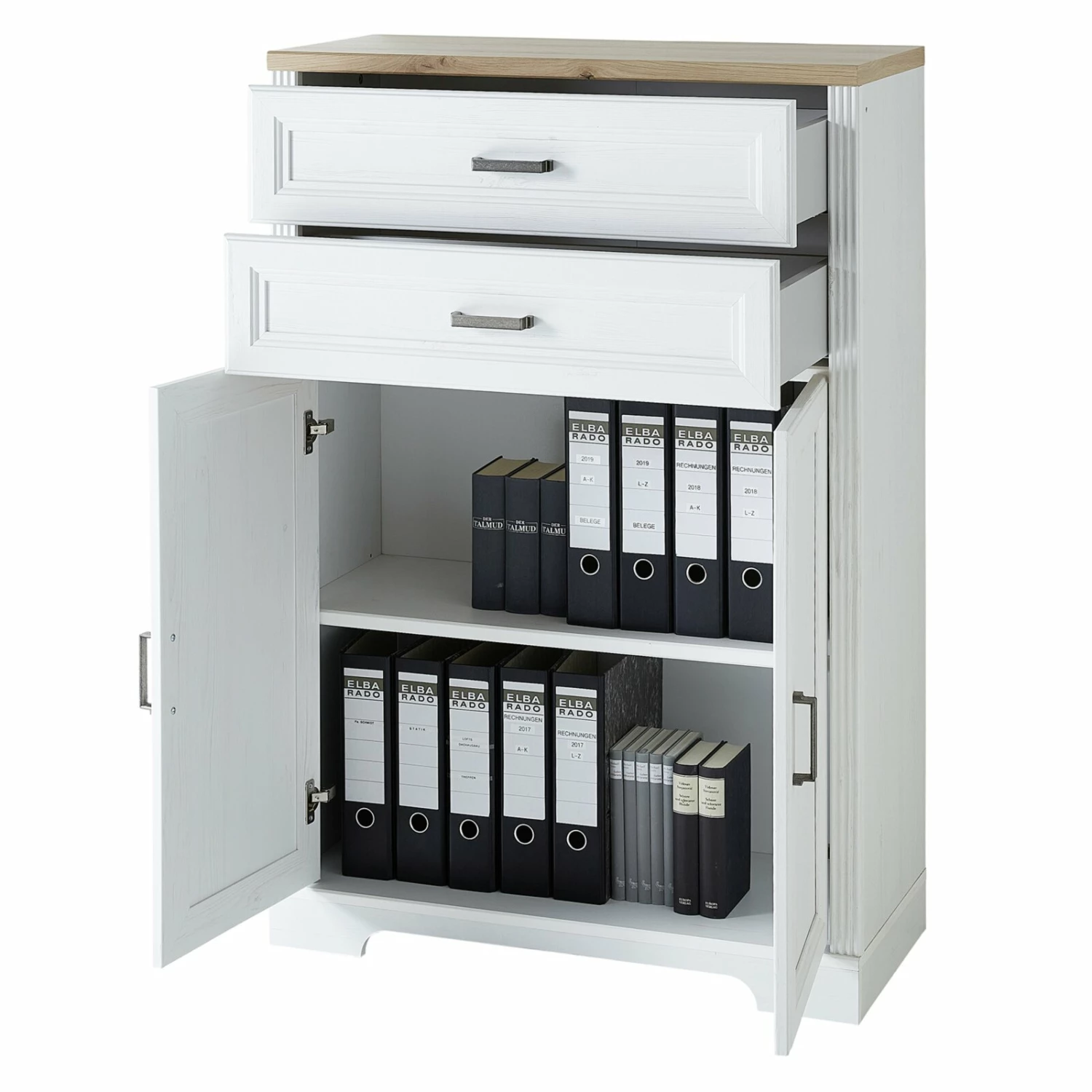 Dieses Stauraumelement aus wunderbar abgestimmten Farben wie Pinie hell Nachbildung und Artisan Eiche Nachbildung ist ein echter Hingucker in jedem Arbeitszimmer. Hinter zwei Türen und in zwei Schubkästen finden Sie reichlich Staufläche für Ihre Büroutensilien, Ordner und Unterlagen. Die Türen sowie Schubkästen sind mit dem Softclose-System ausgestattet, so dass sanftes und leises Schließen gewährleistet wird.