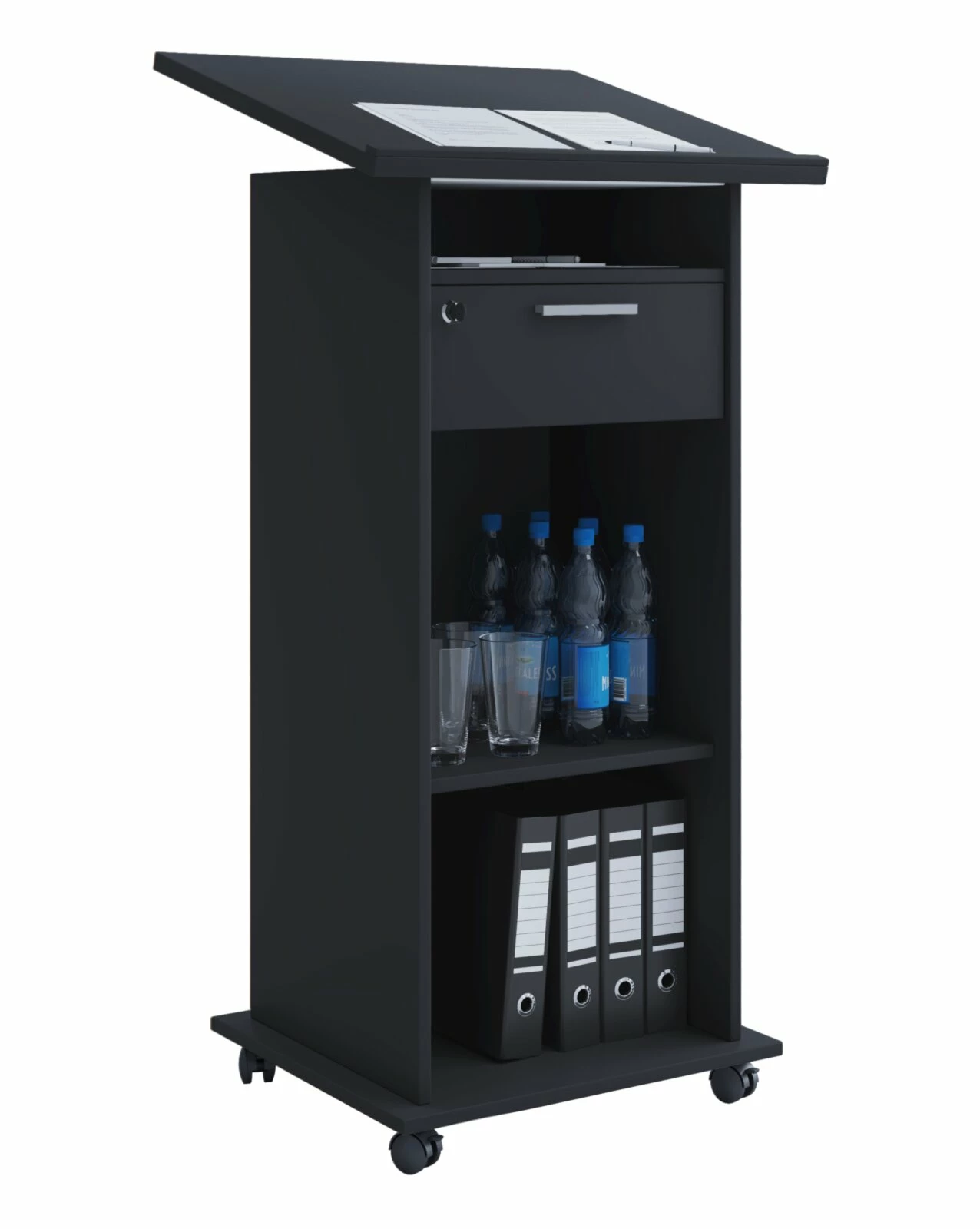 Das Stehpult MEETA in der Farbausführung Schwarz ohne Tür. Mit diesem Stehpult ist ein angenehmes Arbeiten im Stehen garantiert. Das Stehpult bietet Ihnen eine neigbare Rednerpultfläche, so dass Sie diese beliebig anpassen können. Auf der Innenseite des Pults finden Sie insgesamt drei offene Fächer und eine verschließbare Schublade, damit Sie Ihre Büroutensilien und gegebenenfalls wichtige Unterlagen, auch ordentlich und sicher unterbringen können. Die integrierten Rollen aus Kunststoff sorgen für eine hohe Mobilität, damit Sie das Pult mühelos umstellen können. Ein absolutes Must-have in jedem Büro.