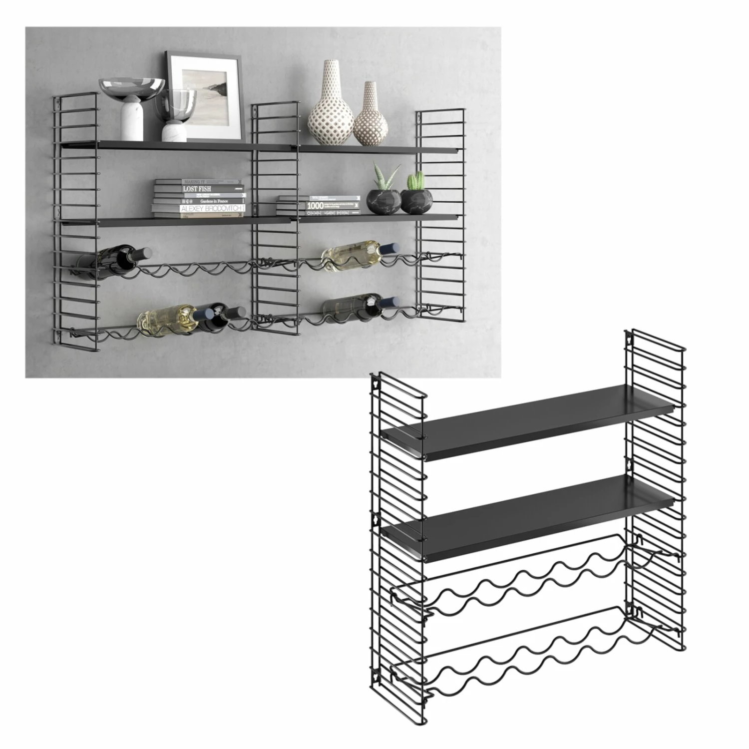 Das Wand–/Weinregalkombi in Schwarz ist modular und endlos erweiterbar. Das Kombiregal überzeugt mit seinen zwei flexibel einhängebaren Metallböden und zwei Weinregalen im schlichten Design und ist ein echter Hingucker für Ihr Zuhause. Hier lassen sich Bücher, Dekorationen und bis zu zwölf Weinflaschen auf stylische Weise unterbringen. Durch das elegante und zeitlose Design der Bücher-/Weinreregal-Kombi werden Ihre persönlichen Lieblingsgegenstände und -weine stilvoll in Szene gesetzt.
