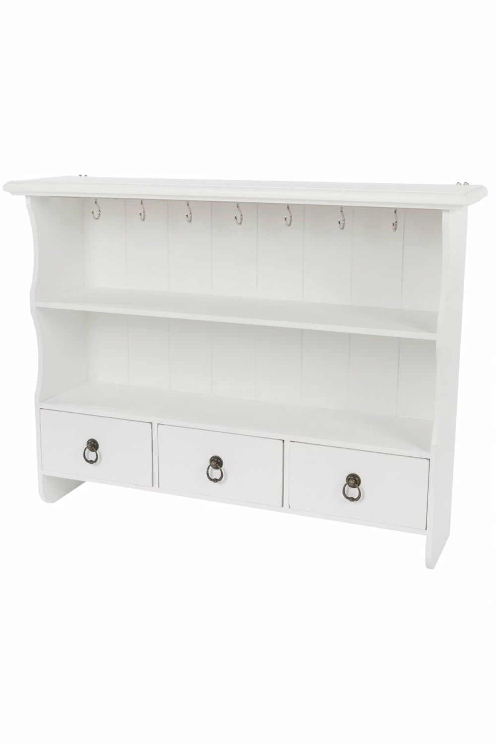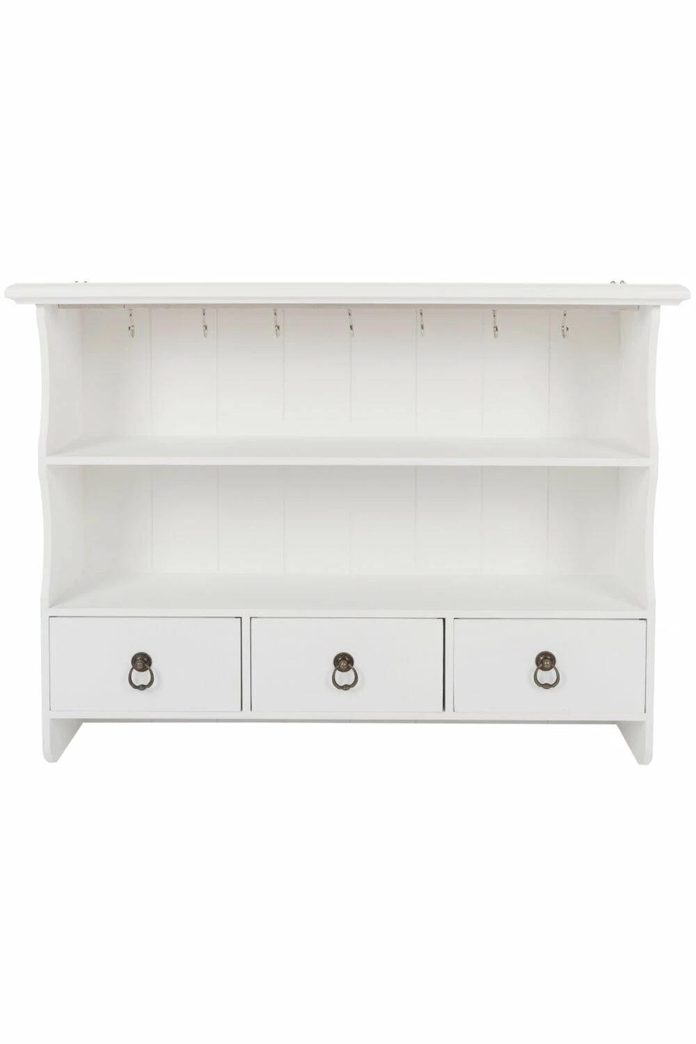 Dieses schöne Wandregal überzeugt durch seine charmante Optik im Landhausstil. Das weiße Regal besitzt eine Rückwand im Paneel-Design, sowie zwei offene Fächer und drei Schubkästen mit Kassettenfront und Ringgriffen. Zusätzlich unterstreichen Ringhaken zur praktischen und stilvollen Aufbewahrung das verspielte Design.