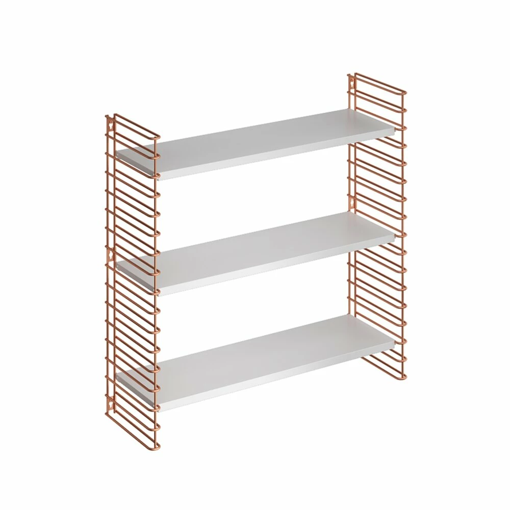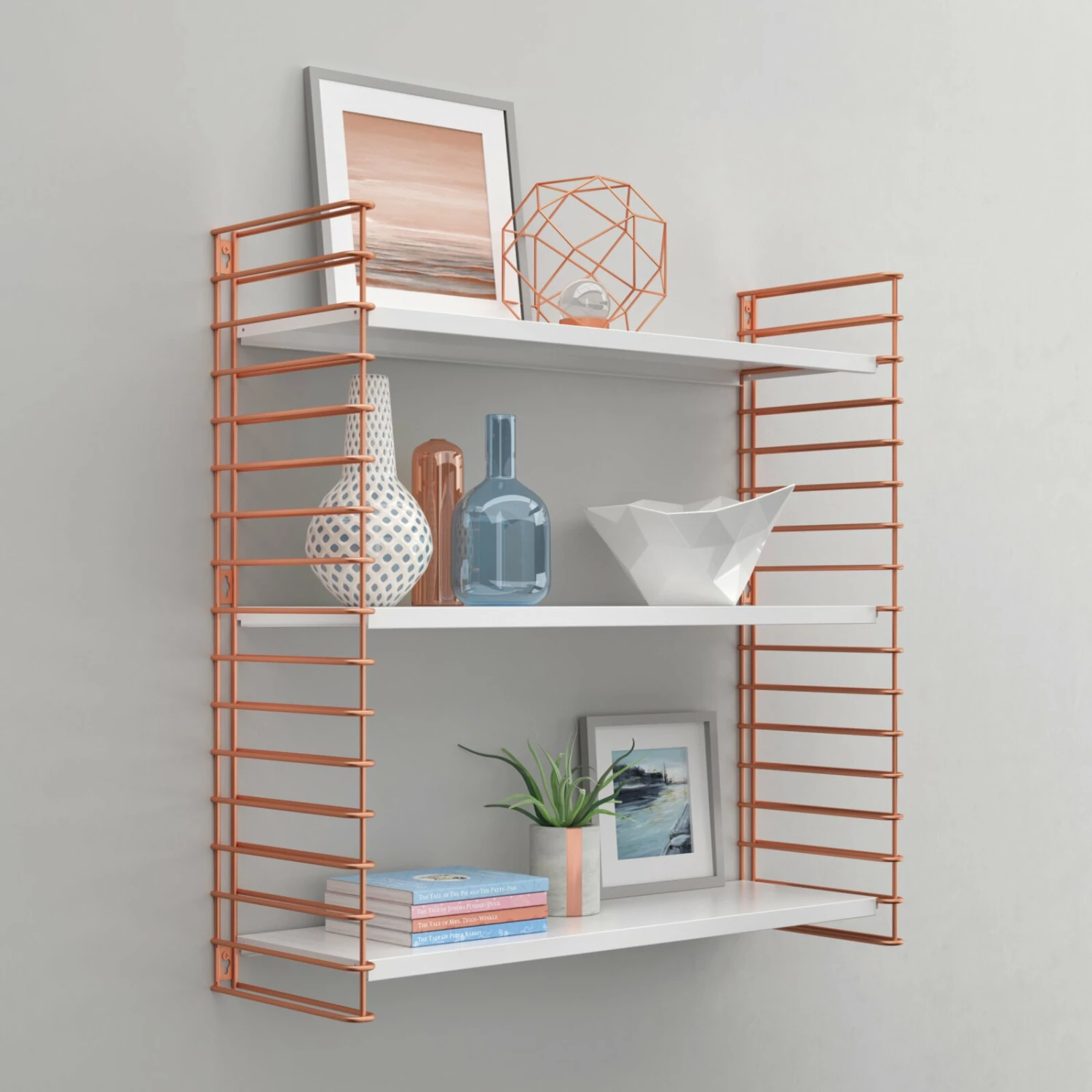 Das Wandregal ist mit seinen drei Ablagen ein echter Hingucker. Hier lassen sich Bücher, Dekorationen und vieles mehr auf stylische Weise unterbringen. Durch das elegante und zeitlose Design des Bücherregals werden Ihre Andenken und Accessoires stilvoll in Szene gesetzt. Mit drei Metallablagen in Weiß und zwei Seitengittern in Kupfer. Die Seitenteile sind dank der exklusiven Polytherm®-Copper Beschichtung stoßfest und antistatisch.