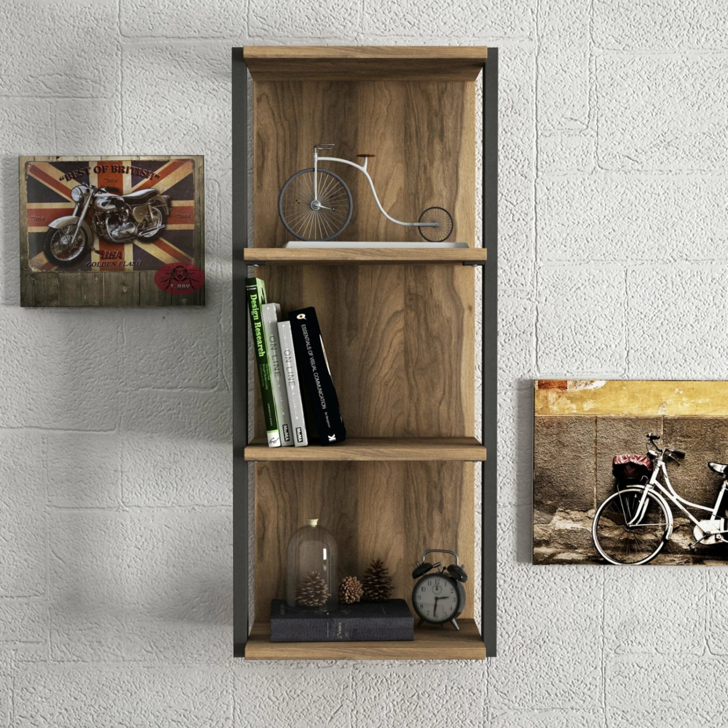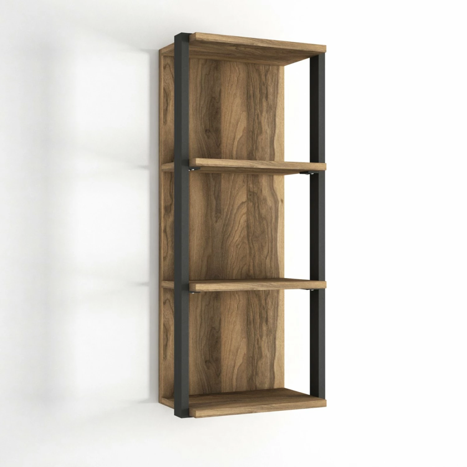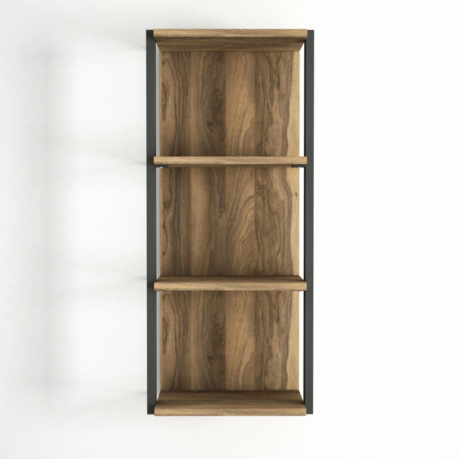 Das stilvolle Wandregal überzeugt durch seine Optik. Es ist im modernen Style gehalten und besteht aus Walnuss farbener Holzoptik und schwarzen Metallrahmen. Das Wandregal verfügt über drei Ablagefächer.