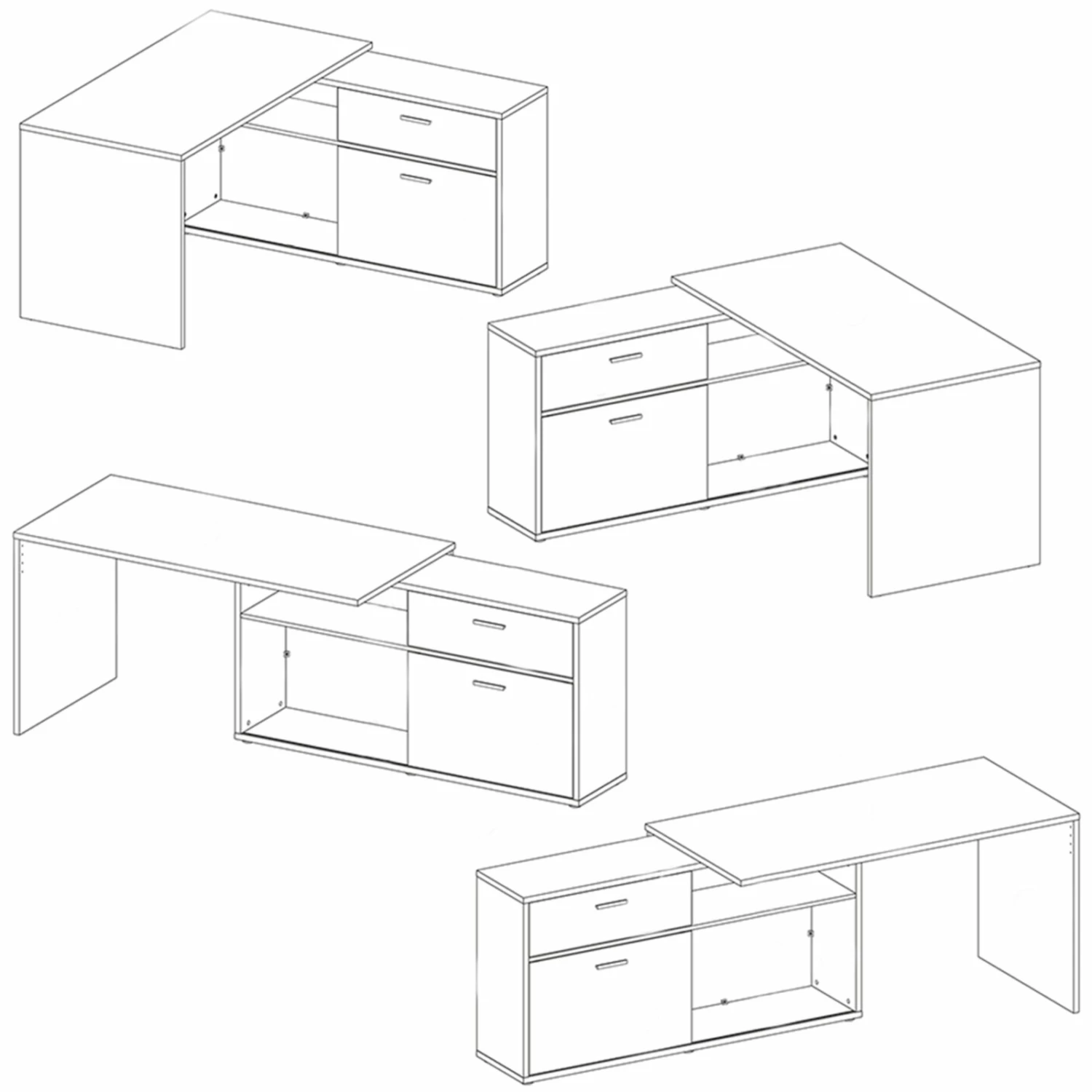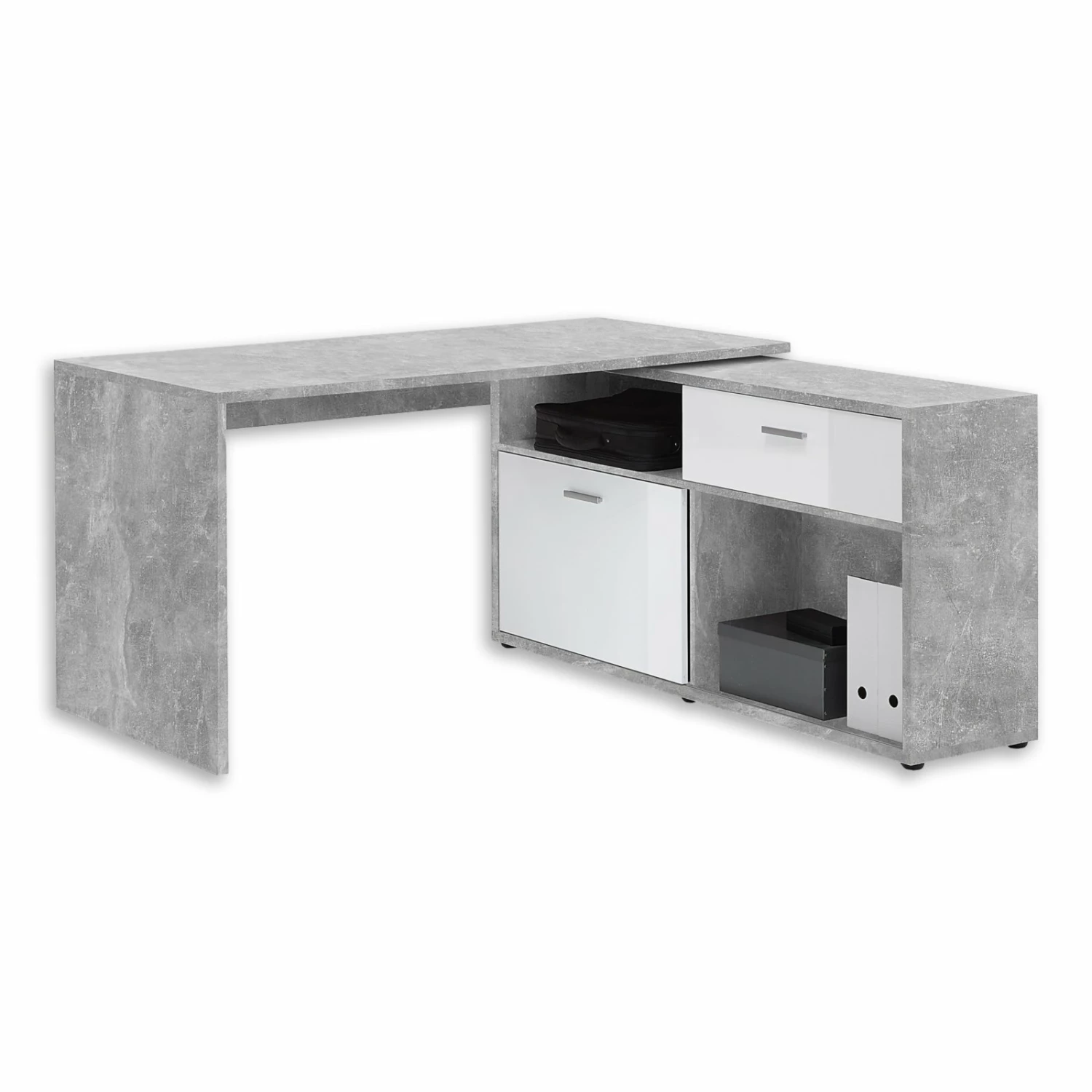 Der Winkel-Schreibtisch wird in Ihrem Büro oder Arbeitszimmer ein praktischer Begleiter sein. Das Design in Betonoptik mit weißen Hochglanz-Fronten abesetzt sieht modern und zugleich sehr wohnlich aus. Das Regal mit einem Schubkasten und einer Schiebetür bietet Ihnen zudem Stauraum für Akten oder Computer- und Bürozubehör.