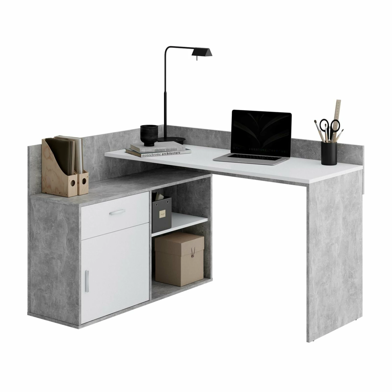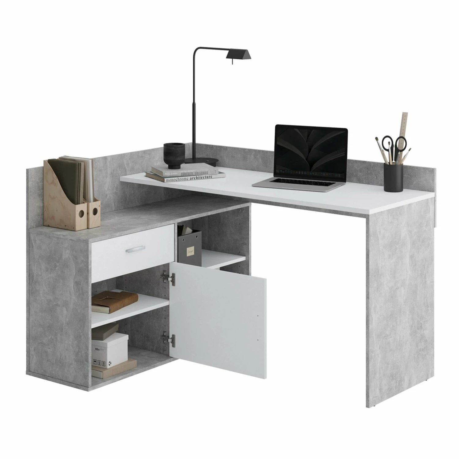 Mit diesem Winkelschreibtisch haben Sie sowohl einen stylischen als auch praktischen Arbeitsplatz. Der etwa 85 cm hohe Schreibtisch verfügt über zwei offene Fächer, eine Tür und ein Schubkasten.